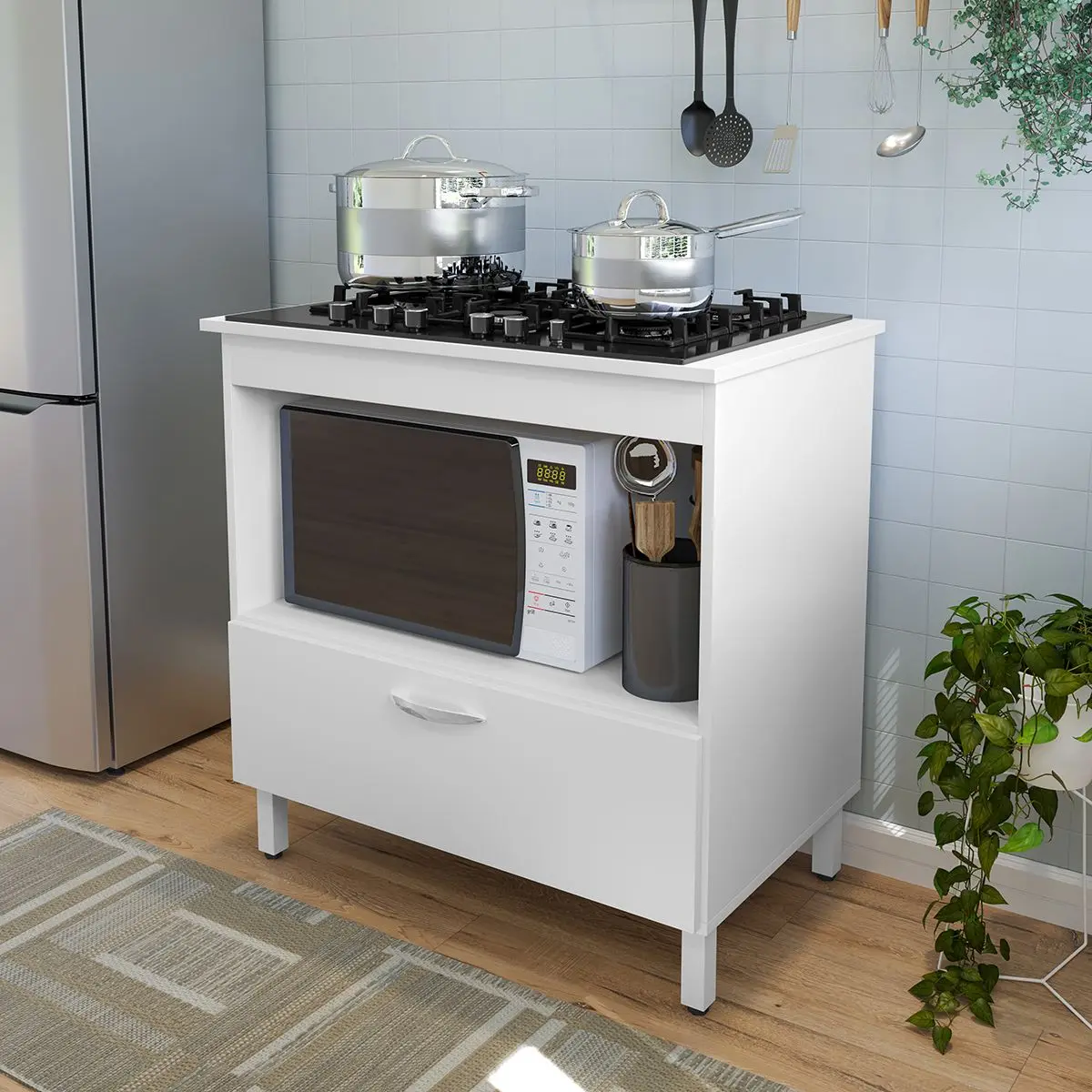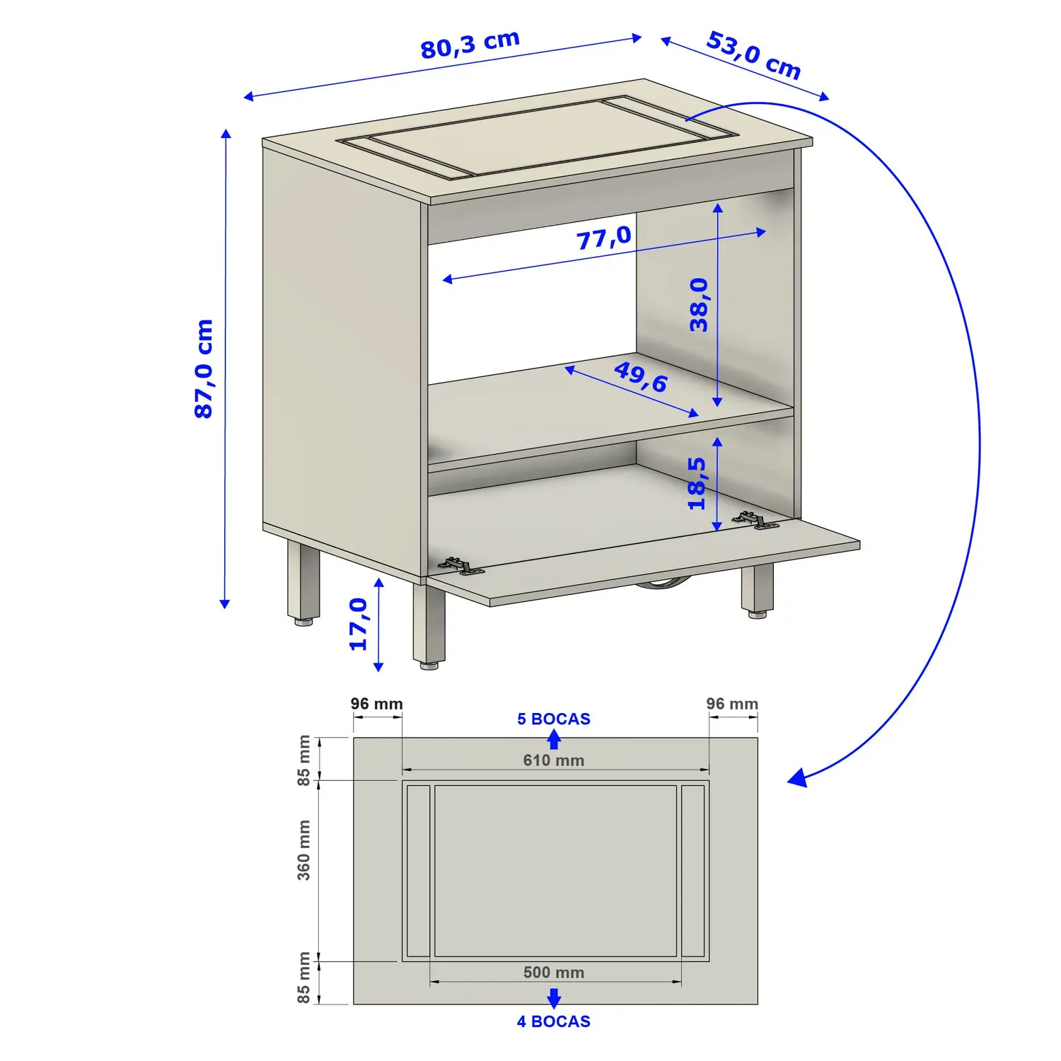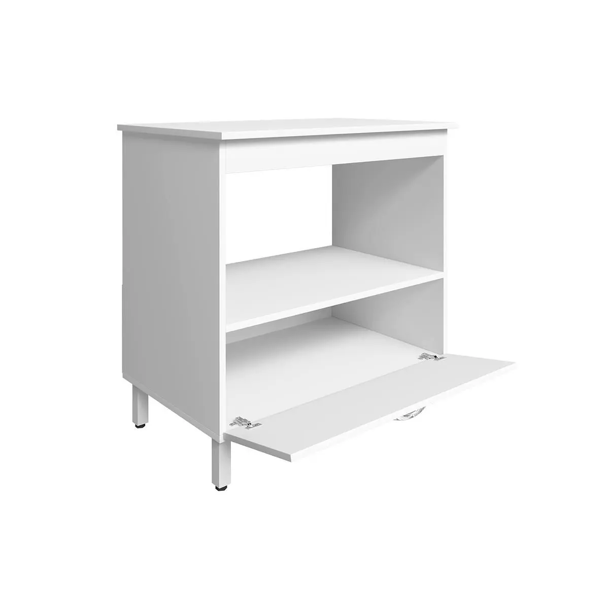 Porta basculante, Pés em PVC com regulagem de altura, Puxador em PVC cromado.