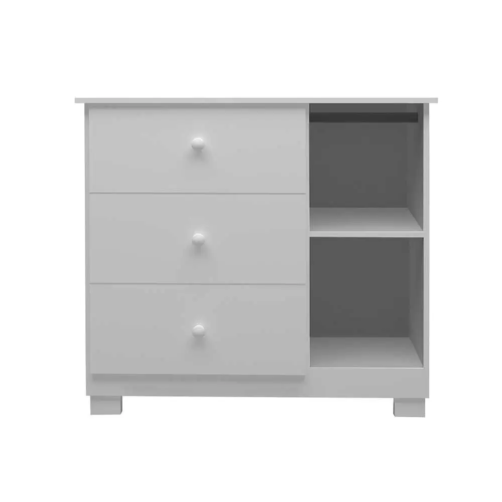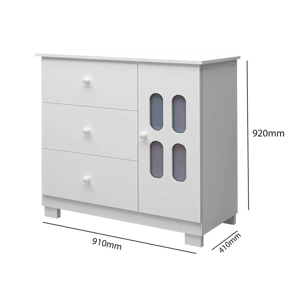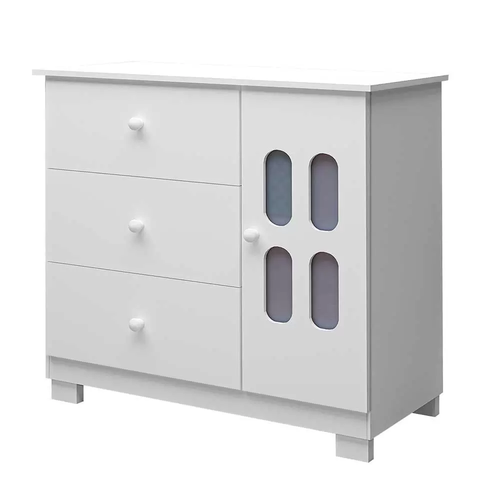 Quantidade de Gavetas: 3 Quantidade de Portas: 1 O tampo e frente das gavetas são feitos em MDP Pintura UV de composição não tóxica. Corrediças Metálicas